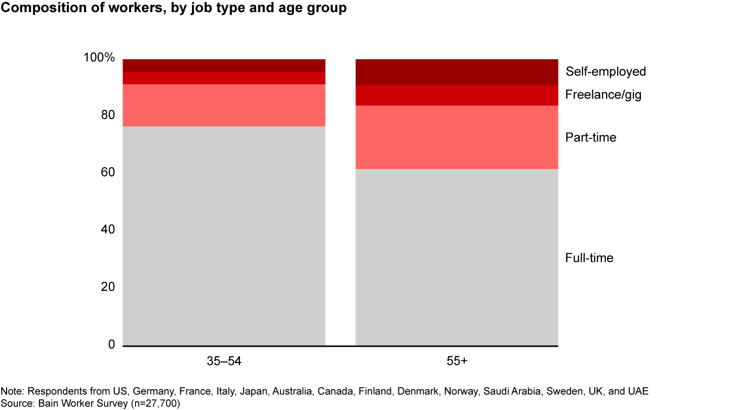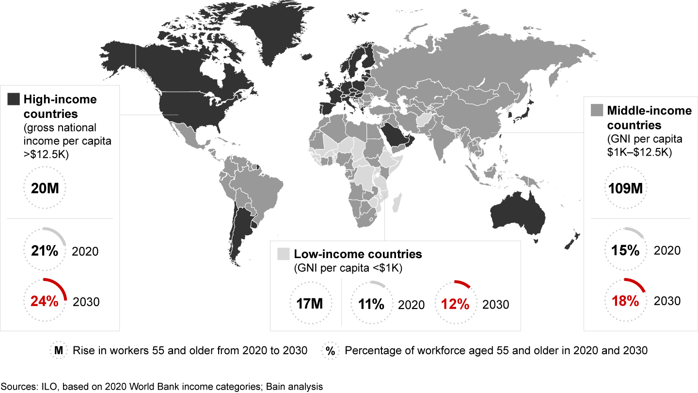 This isn’t an issue exclusively in developed markets. China’s elderly population (65 and older) will double by 2050. Brazil’s proportion of workers over age 55 is creeping up to the midteens. Globally, approximately 150 million jobs will shift to workers 55 and older by the end of the decade, Bain estimates. That’s not far short of the entire working population of the US (see Figure 3).