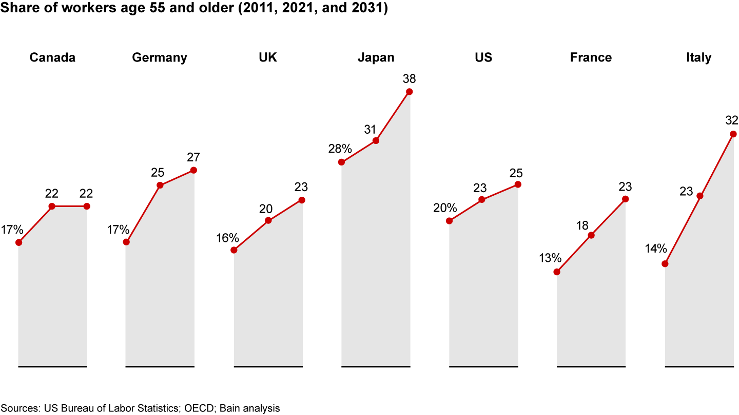 In the Group of Seven countries, workers age 55 and older will exceed 25% of the workforce by 2031, nearly 10 percentage points higher than in 2011, according to Bain analysis. Japan is the extreme case. By 2031, Japanese workers 55 and older will approach 40% of the workforce. According to Gallup, 41% of American workers expect to work beyond age 65. Thirty years ago, it was 12%. Even the spike in retirements during the peak-Covid Great Resignation now looks more like a Great Sabbatical, a blip in the long-term trend data, with a higher percentage of retirees reentering the workforce than in February 2019.